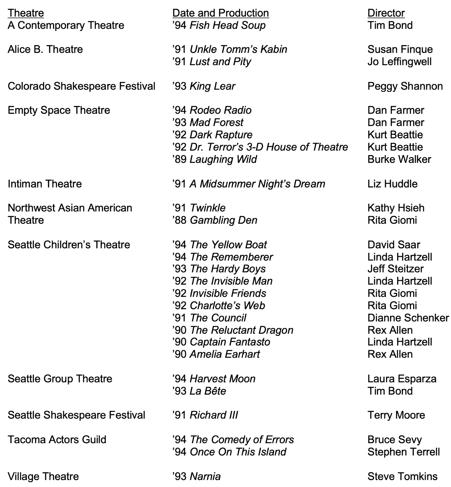 Bachelor of Arts, University of Washington (Seattle, WA), Drama, 1987