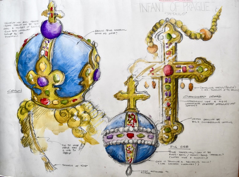 With this in mind, I went out to do some research on the Infant and found myself a plastic four-inch figurine of Him in a Catholic store. To "update" His attire, I gave Him an oversized "Imperial Margarine" type crown and a 17th Century styled quilted petticoat for His cloak. And voila, here we have an Infant of Prague dazzlingly dressed for Sally's prime-time show!